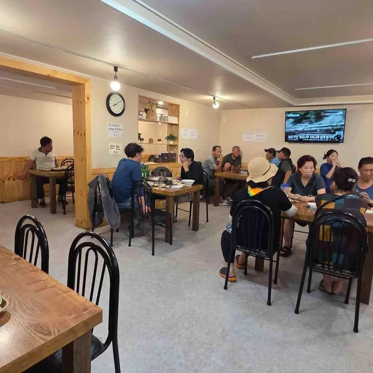 식당 내부는 깔끔하고 정돈된 모습이에요. 나무 테이블과 의자들이 배치되어 있어 편안한 분위기를 자아내고, 여러 그룹의 손님들이 대화를 나누며 식사를 즐기고 있는 모습이 인상적이에요.