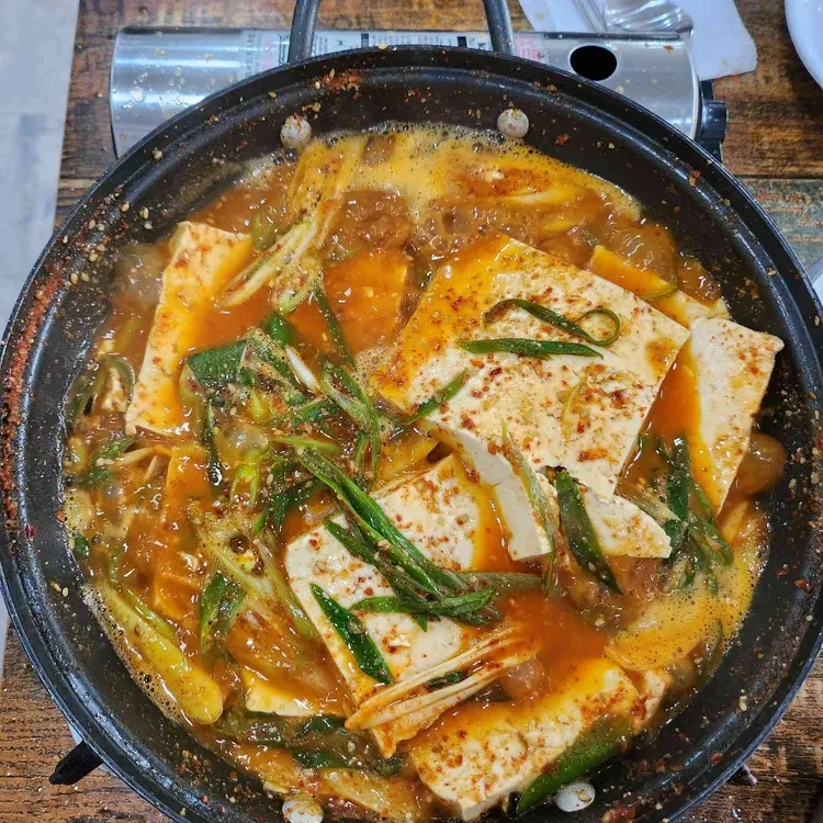 이 사진은 두부전골의 모습인데, 신선한 재료들이 가득 담겨 있어요. 가격 대비 양도 많아서 친구들과 함께 가면 나눠 먹기에도 좋아요.