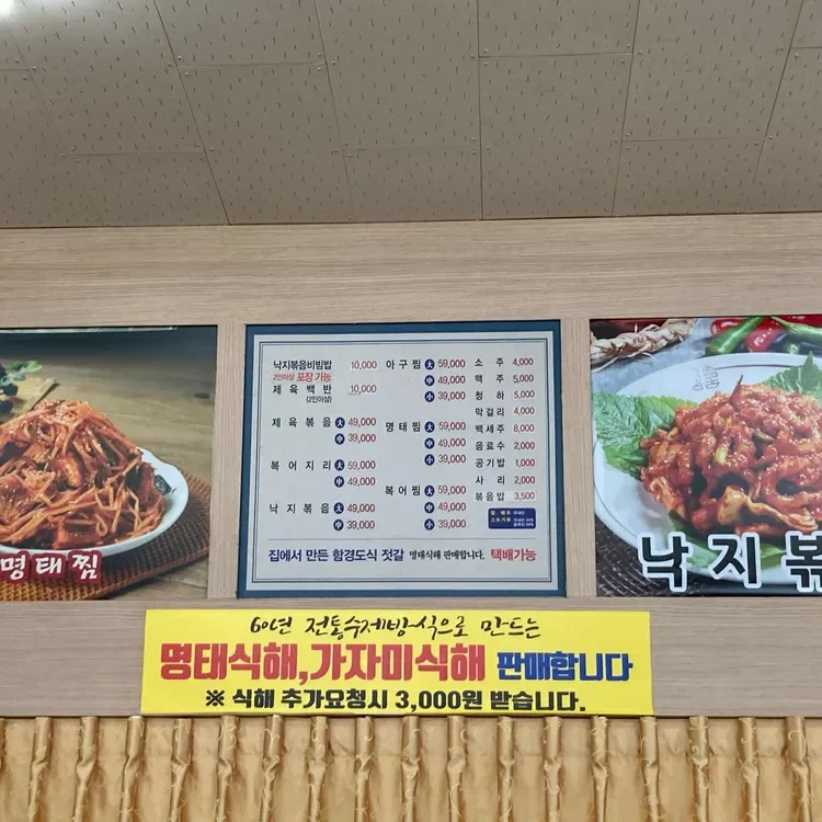 바래봉식당의 대표 메뉴는 낙지볶음비빔밥이에요. 신선한 낙지와 다양한 채소가 어우러져 정말 맛있어요. 이 외에도 명태찜이 인기인데, 부드러운 명태와 함께 나오는 양념이 일품이에요. 메뉴판에는 다양한 해산물 요리가 있어 선택의 폭이 넓답니다.