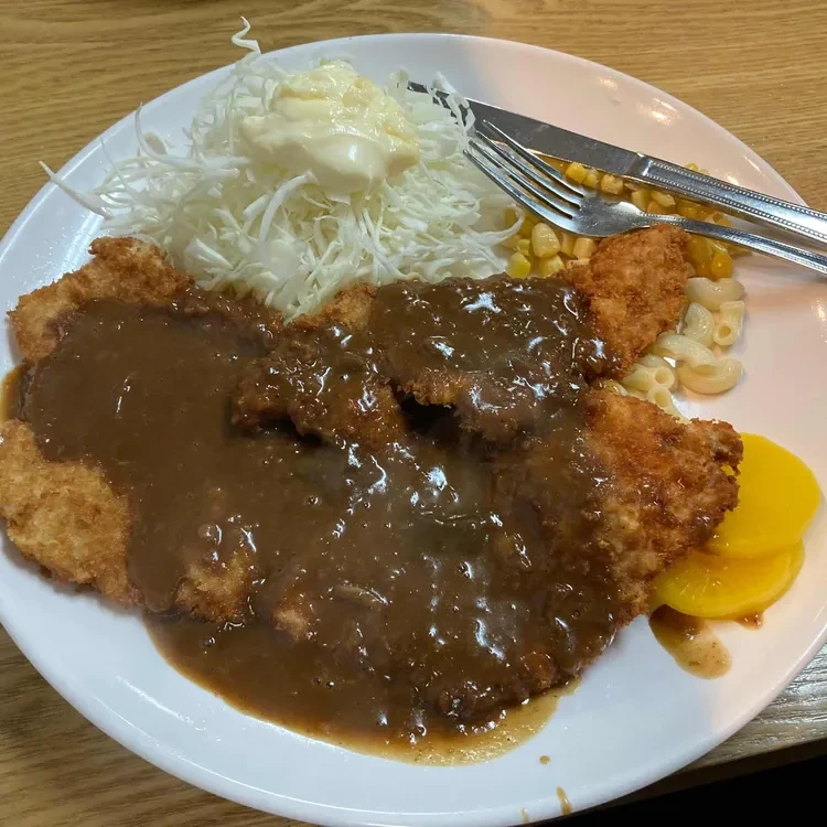 돈까스는 바삭한 튀김옷과 함께 육즙이 가득한 고기가 특징이에요. 또한, 사이드로 제공되는 샐러드와 마카로니, 옥수수도 맛있답니다.