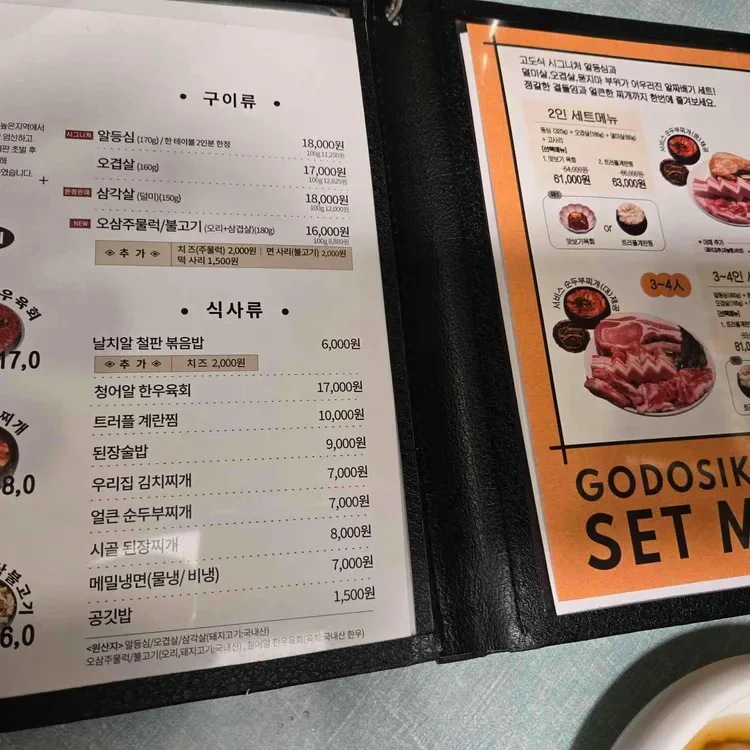 고도식의 메뉴는 다양하고, 특히 고기 종류가 많아요. 제가 추천하는 메뉴는 알등심과 목살이에요. 알등심은 부드럽고 육즙이 가득해 정말 맛있답니다. 목살은 고소한 맛이 일품이에요. 가격은 알등심이 18,000원, 목살이 16,000원 정도로, 합리적인 가격에 푸짐한 양을 즐길 수 있어요.
