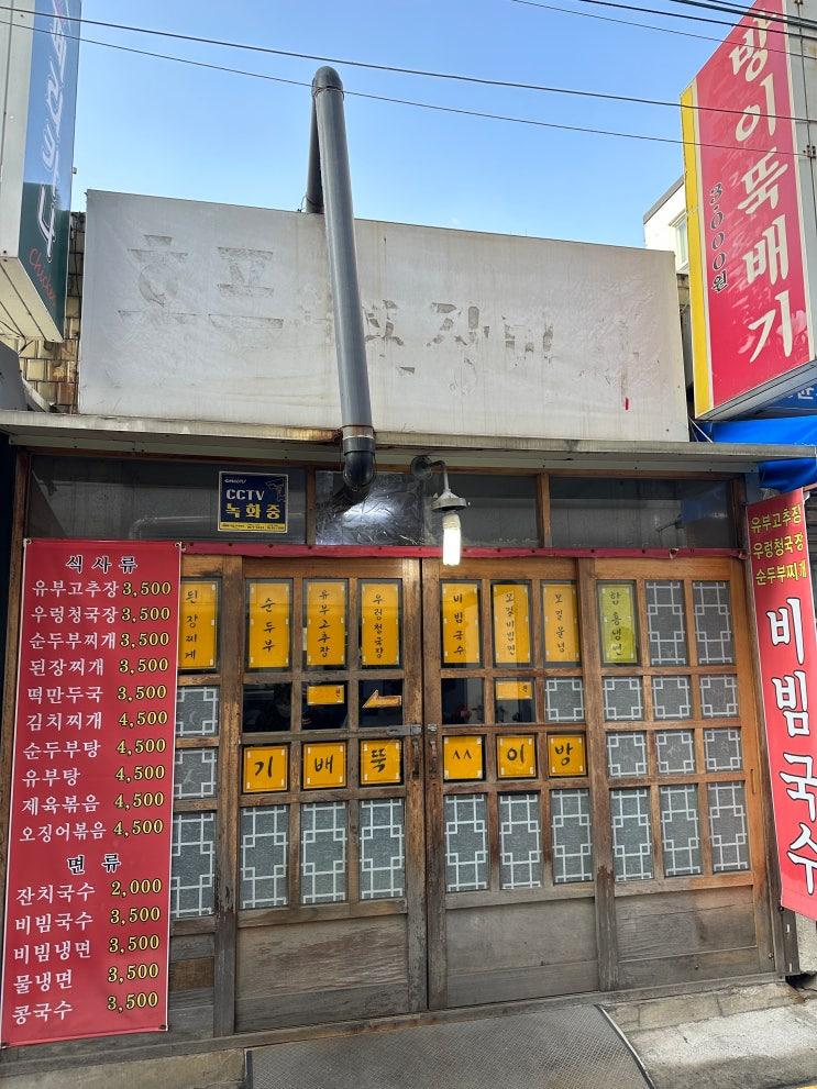 방이뚝배기는 서울 송파구 방이동에 위치한 전통 한국 음식점이에요. 이곳은 간단한 외관이지만, 들어서면 아늑한 분위기가 느껴져요. 식당의 입구는 나무로 된 문과 유리창으로 되어 있어, 내부가 살짝 보이는데요, 메뉴판이 잘 보이도록 배치되어 있어요.