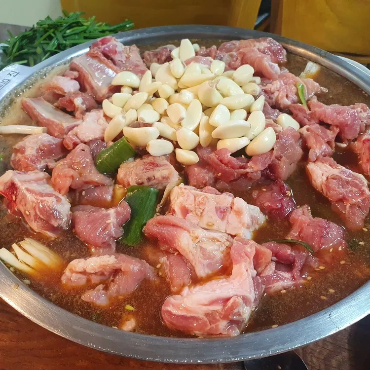 경상도집의 대표 메뉴는 바로 물갈비예요. 돼지갈비를 자작한 육수에 끓여내는 방식으로, 그 양이 정말 푸짐해요. 가격은 1인분에 약 12,000원 정도로, 양에 비해 매우 합리적이에요. 이 외에도 다양한 반찬과 함께 제공되며, 특히 마늘과 대파가 듬뿍 들어가 있어 풍미가 더욱 깊어요.