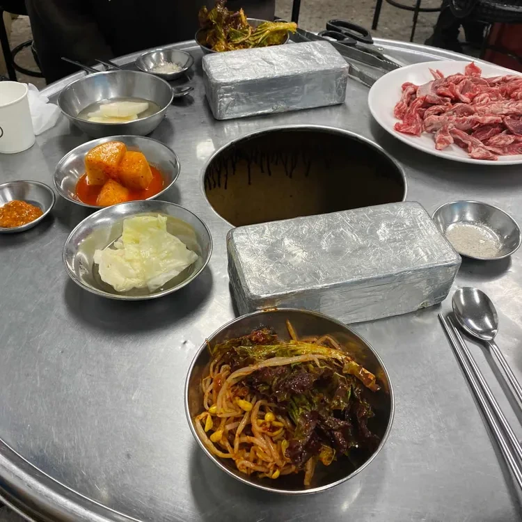 식당 내부는 아늑하고 편안한 분위기로 꾸며져 있어요. 원형 테이블이 배치되어 있어 가족이나 친구들과 함께 앉아 식사하기에 좋고, 바베큐를 즐길 수 있는 그릴이 중앙에 있어요. 다양한 반찬들이 준비되어 있어, 고기와 함께 즐기기 좋답니다.