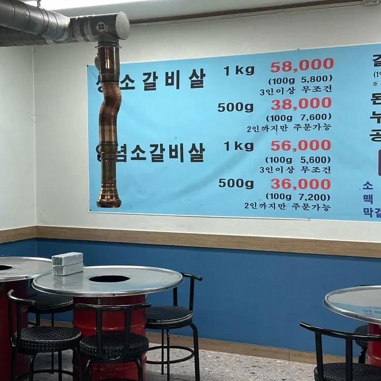 리틀본수원갈비집의 대표 메뉴는 갈비탕과 갈비살이에요. 갈비탕은 깊고 진한 국물 맛이 일품이며, 고기가 푸짐하게 들어가 있어요. 가격은 1인분 기준으로 약 10,000원 정도로, 가성비가 뛰어나죠. 갈비살은 1kg 기준으로 약 30,000원 정도로, 신선한 고기를 사용해 맛이 정말 좋아요. 메뉴판은 식당 내부의 파란 벽에 잘 정리되어 있어 쉽게 확인할 수 있어요.