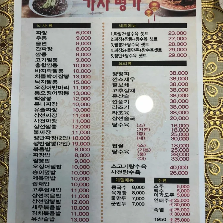 가사명가의 메뉴는 정말 다양해요. 주 메뉴로는 짬뽕, 짜장, 탕수육 등이 있으며, 세트 메뉴도 준비되어 있어요. 가격대는 6,000원부터 38,000원까지 다양하고, 세트 메뉴는 가격이 더 저렴하게 구성되어 있어요. 특히, 해물 짬뽕은 신선한 해물이 가득 들어가 있어 추천할 만해요.