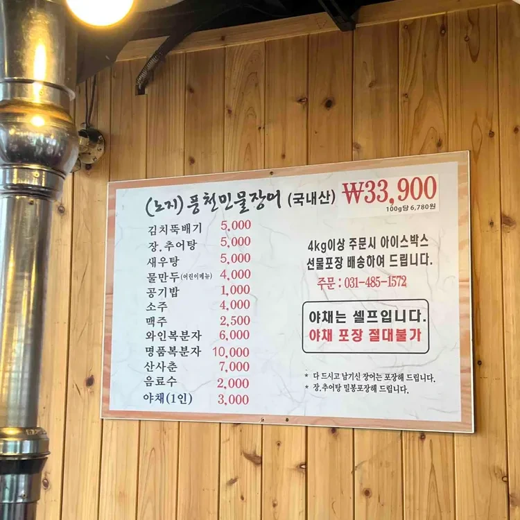천장어의 대표 메뉴는 "흑천민물장어"인데요, 100g에 ₩33,900으로 가격이 책정되어 있어요. 이 외에도 다양한 사이드 메뉴가 준비되어 있는데, "김치똥배기"는 ₩1,000, "장추어랑"은 ₩6,000, 그리고 "새우탕"은 ₩6,000이에요. 메뉴판은 깔끔하게 정리되어 있어 선택하기 쉽답니다.