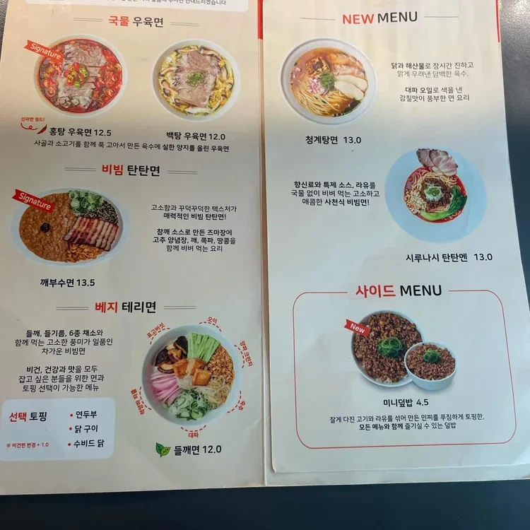 정육면체의 메뉴는 다양하지만, 특히 추천하고 싶은 메뉴는 '홍탕 우육면'과 '비빔 탄탄면'이에요. 홍탕 우육면은 진한 국물과 부드러운 고기가 어우러져 깊은 맛을 느낄 수 있어요. 가격은 약 9,000원 정도로, 양도 푸짐해요. 비빔 탄탄면은 매콤한 소스와 함께 제공되며, 고소한 맛이 일품이에요. 가격은 8,500원으로, 사이드 메뉴로는 '미니불면'이 추천돼요.