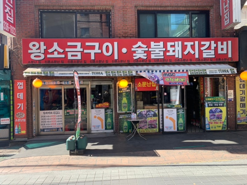소문난집은 신촌의 번화가에 위치해 있어요. 외관은 밝은 빨간색 간판이 눈에 띄고, 다양한 메뉴가 적힌 포스터가 붙어 있어요.