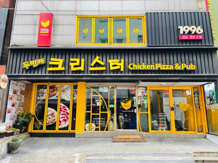 크리스터치킨은 신촌의 중심가에 위치해 있어요. 외관은 현대적인 디자인으로, 검은색과 노란색의 조화가 눈에 띄어요. 큰 유리창을 통해 내부의 활기찬 분위기를 엿볼 수 있답니다.
