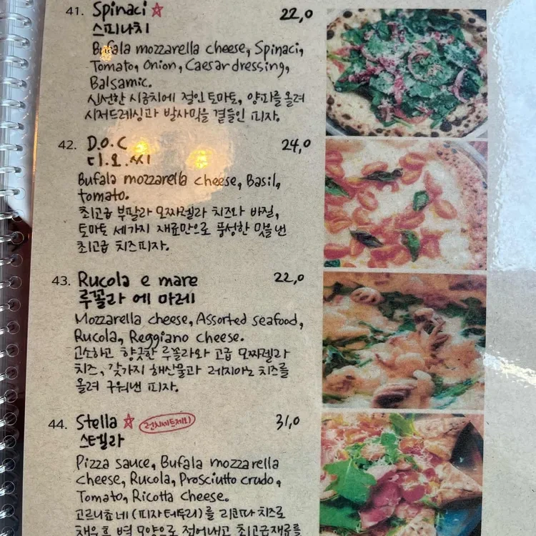 에서 보실 수 있는 것처럼 신선한 아루굴라와 프로슈토가 올려져 있어요. 이 조합이 정말 맛있답니다! 메뉴판을 보면