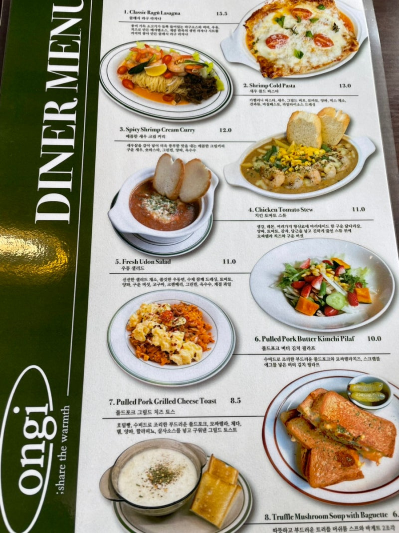 온기의 메뉴는 다양하고, 특히 파스타와 브런치 메뉴가 유명해요. 메뉴판을 보면 클래식 라구 라자냐, 새우 차가운 파스타, 매운 새우 크림 카레 등 다양한 요리가 있어요. 가격대는 6,000원에서 15,500원까지 다양해요.