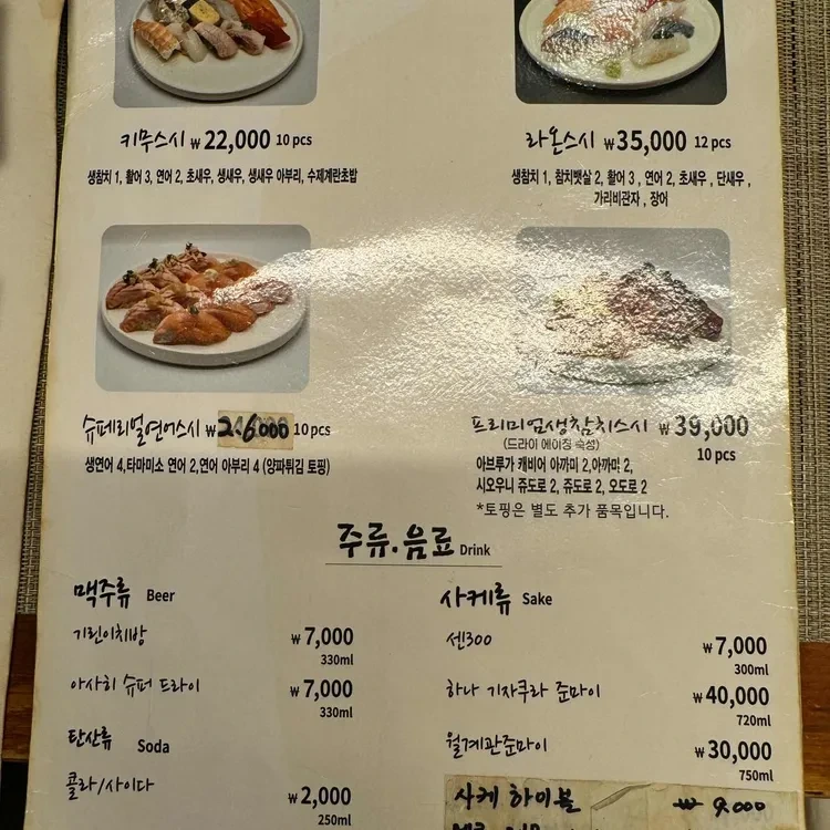 또한, 음료 메뉴도 다양해요. 맥주, 사케, 탄산음료 등이 준비되어 있으며, 가격은 2,000원부터 40,000원까지 다양하답니다.