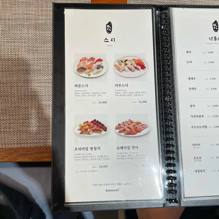 키무스시의 메뉴는 다양하고 가격대도 합리적이에요. 특히 추천하고 싶은 메뉴는 "키무스시" 세트로, 10피스가 22,000원이에요. 이 외에도 "라온스시"는 12피스에 35,000원, "트리미엄 생선회"는 10피스에 39,000원으로 구성되어 있어요. 메뉴판에는 각 요리의 재료와 설명이 잘 되어 있어서 선택하는 데 도움이 돼요.