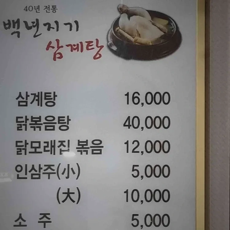 메뉴판을 보면, 닭볶음탕은 40,000원, 닭모래찜 볶음은 12,000원, 인삼주는 소주와 함께 즐길 수 있어요. 특히, 삼계탕은 국물이 진하고 깊은 맛이 나서 정말 맛있어요.
