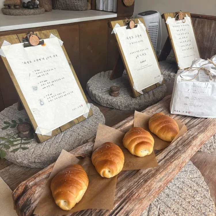 자연도 소금빵의 인테리어는 아늑하고 따뜻한 느낌이에요. 나무로 된 테이블과 의자, 그리고 소박한 장식들이 어우러져 편안한 분위기를 만들어 주죠.