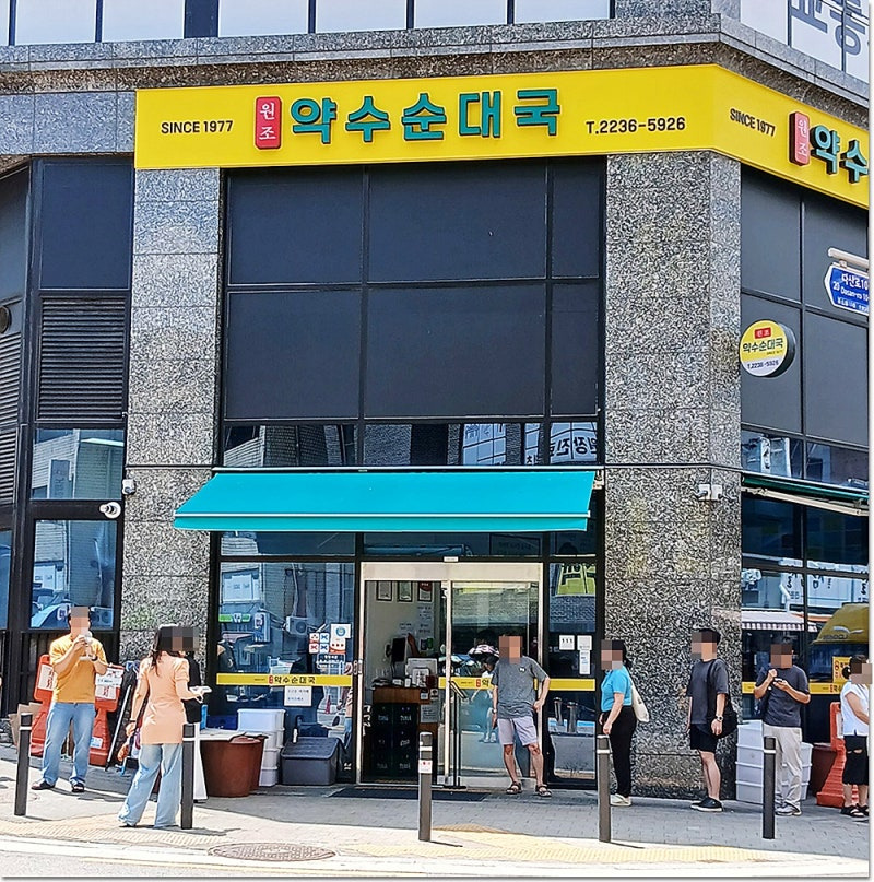 약수순대국은 약수역 1번 출구로 나와서 도보로 5분 정도 거리에 위치해 있어요. 이 식당은 1977년에 오픈한 전통 있는 곳으로, 노란색과 초록색 간판이 눈에 확 띄어요.