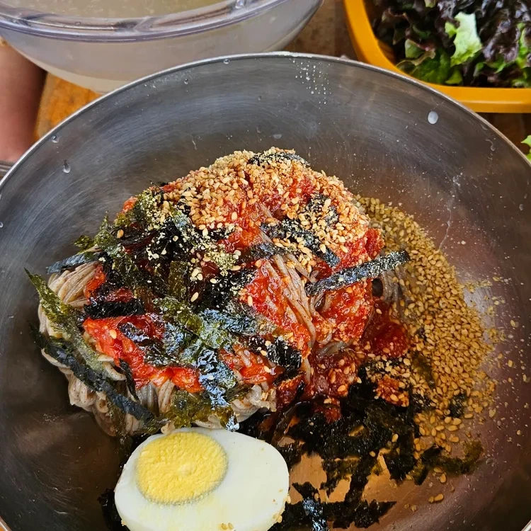 메밀국수의 맛은 정말 일품이에요. 차가운 육수는 시원하고 깔끔한 맛을 자랑하며, 메밀의 고소한 맛이 잘 어우러져 있어요. 고명으로 올라간 삶은 계란과 해조류는 식감을 더해주고, 참깨의 고소함이 국수와 잘 어울려요.