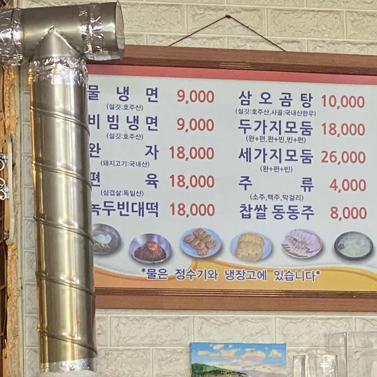이곳의 대표 메뉴는 물냉면과 비빔냉면이야. 물냉면은 9,000원, 비빔냉면도 9,000원으로 가격이 합리적이야. 그리고 삼오 곰탕은 10,000원으로, 깊고 진한 국물 맛이 일품이야. 내가 주문한 물냉면은 면발이 쫄깃하고 국물이 시원해서 정말 맛있었어.