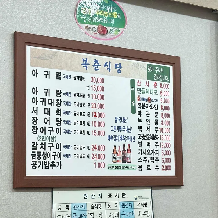 복춘식당의 가격대는 아귀탕이 15,000원, 아귀찜이 30,000원, 장어구이가 10,000원으로, 해산물 요리 치고는 합리적인 편이에요. 특히 양이 푸짐하고 맛이 뛰어나서 가성비가 좋다고 느껴졌어요.