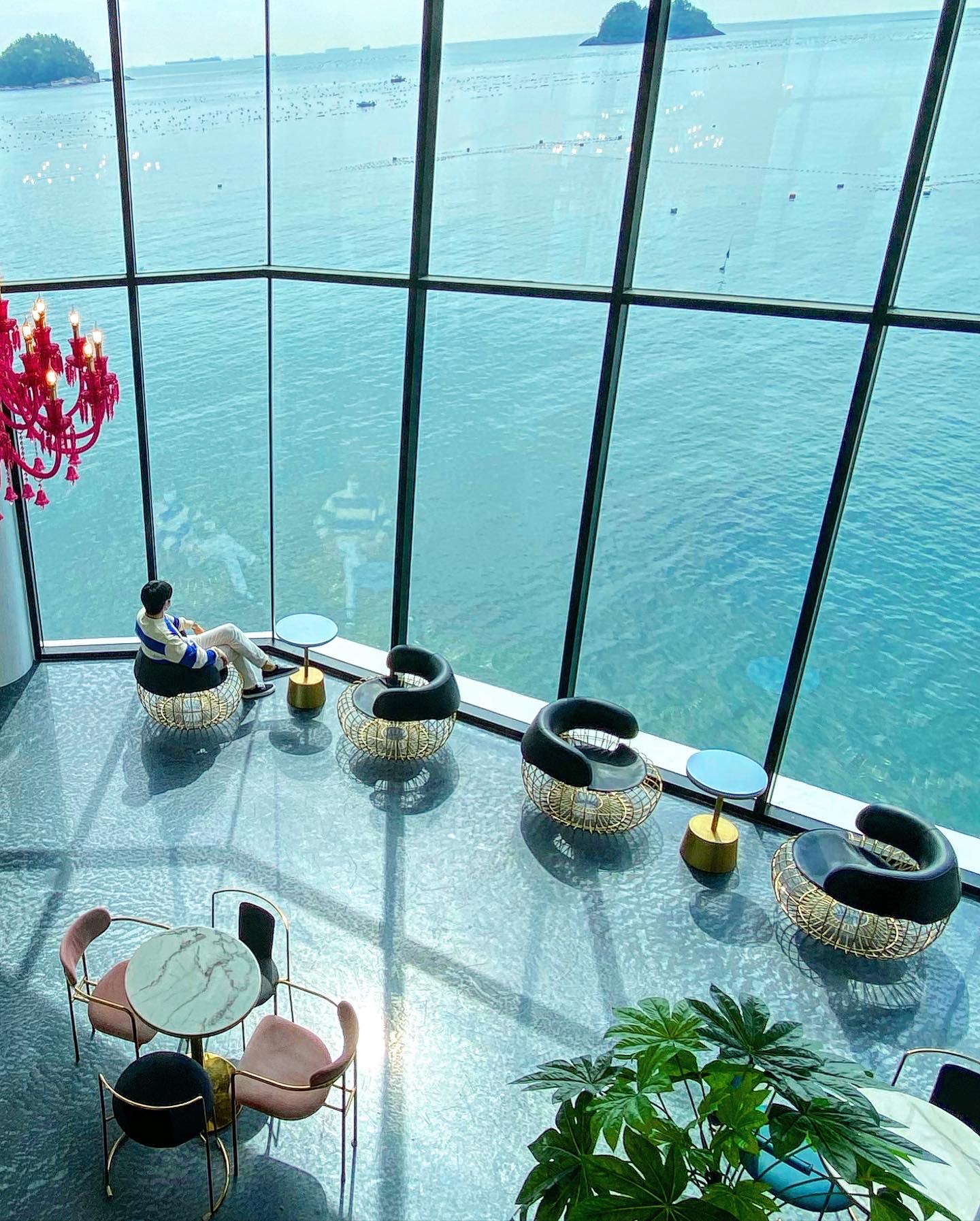 카페 내부는 세련된 인테리어로 꾸며져 있어요. 큰 유리창을 통해 들어오는 햇살과 바다의 경치가 어우러져 정말 아름다워요. 다양한 색상의 의자와 테이블이 조화를 이루며, 편안한 소파도 있어 여유롭게 앉아있기 좋답니다.