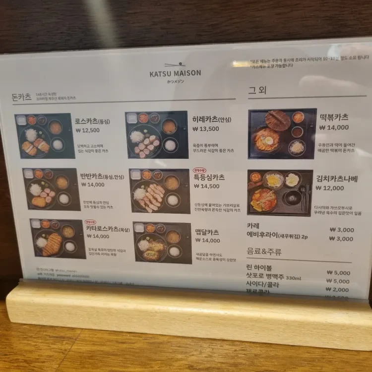 가츠메종의 메뉴는 다양하지만, 특히 추천하고 싶은 메뉴는 로스카츠와 히레카츠예요. 로스카츠는 두툼한 돼지고기를 바삭하게 튀겨낸 돈까스인데, 가격은 ₩12,500이에요. 히레카츠는 부드러운 안심 부위를 사용해 가격은 ₩13,500이에요. 이 외에도 반반카츠(₩14,000)와 떡볶이카츠(₩14,000) 같은 독특한 메뉴도 있어요. 메뉴판을 보면 다양한 선택지가 있어 고민하게 되더라고요.
