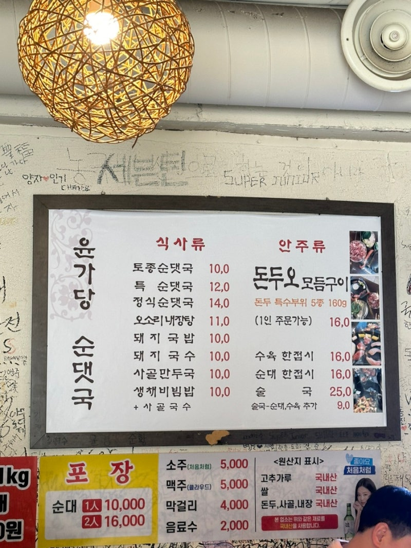 윤가당의 메뉴는 주로 순대국과 다양한 한식으로 구성되어 있어요. 대표적인 메뉴는 순대국을 비롯해 오소리내장탕, 돼지국밥, 만두국 등이 있습니다. 가격대는 10,000원에서 14,000원 사이로, 가성비가 좋은 편이에요. 메뉴판의 모습은 이렇게 생겼답니다.