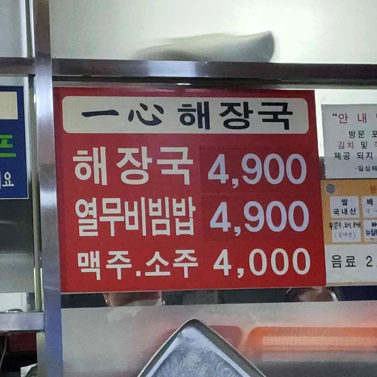 일심해장국의 대표 메뉴는 해장국이에요. 이곳의 해장국은 진한 국물과 신선한 재료로 만들어져, 속이 확 풀리는 맛이랍니다. 가격은 4,900원으로 매우 합리적이에요. 또한, 열무비빔밥도 추천하는 메뉴 중 하나로, 역시 4,900원에 제공된답니다. 메뉴판을 보면, 맥주와 소주도 각각 4,000원에 판매하고 있어요.