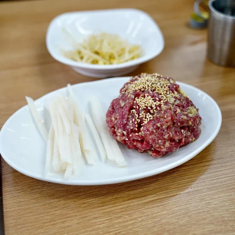 이곳의 추천 메뉴는 여러 가지가 있지만, 특히 '등심'과 '육회'는 꼭 드셔보셔야 해요. 등심은 180g 기준으로 38,000원이며, 육회는 30,000원이에요. 불고기 백반도 17,000원으로 가성비가 좋고, 기본 반찬도 정갈하게 나와서 만족스러워요.
