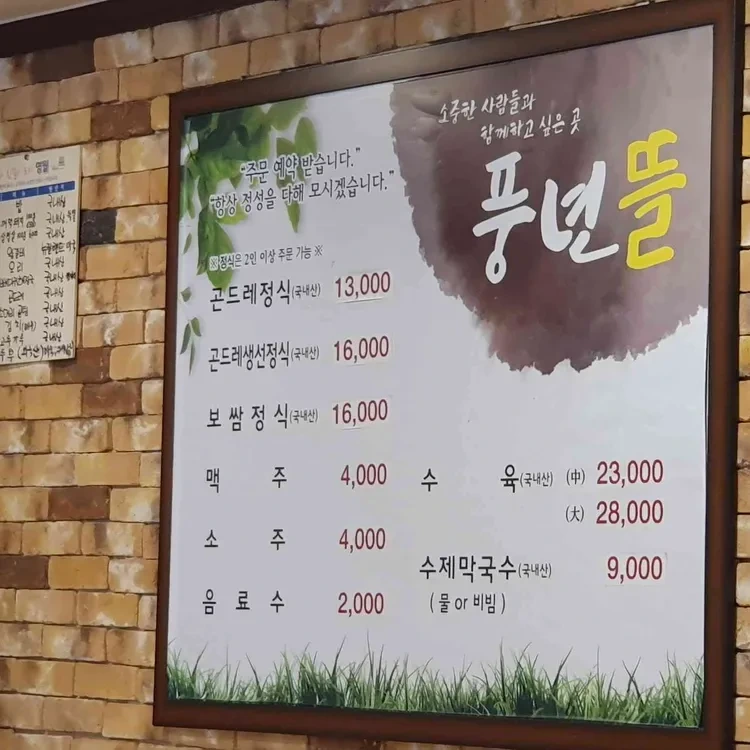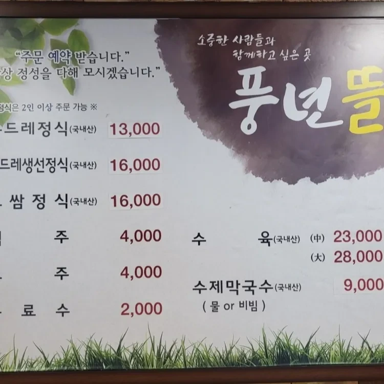풍년뜰의 메뉴는 다양하고 가격도 합리적이에요. 특히 추천하고 싶은 메뉴는 '곤드레정식'으로, 가격은 13,000원이랍니다. 이 외에도 '곤드레생선정식'과 '보쌈정식'이 각각 16,000원에 제공되며, '수육'은 중 사이즈가 23,000원, 대 사이즈가 28,000원이에요. 또한, '수제막국수'는 9,000원으로 가볍게 즐기기 좋은 메뉴랍니다.