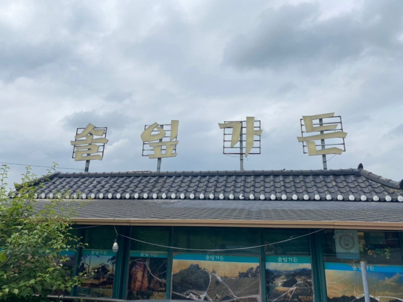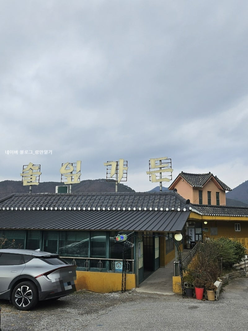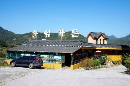 솔잎가든은 영월의 아름다운 자연 속에 자리 잡고 있어요. 전통적인 한옥 스타일의 건물로, 어두운 기와 지붕과 노란 외벽이 인상적이에요.