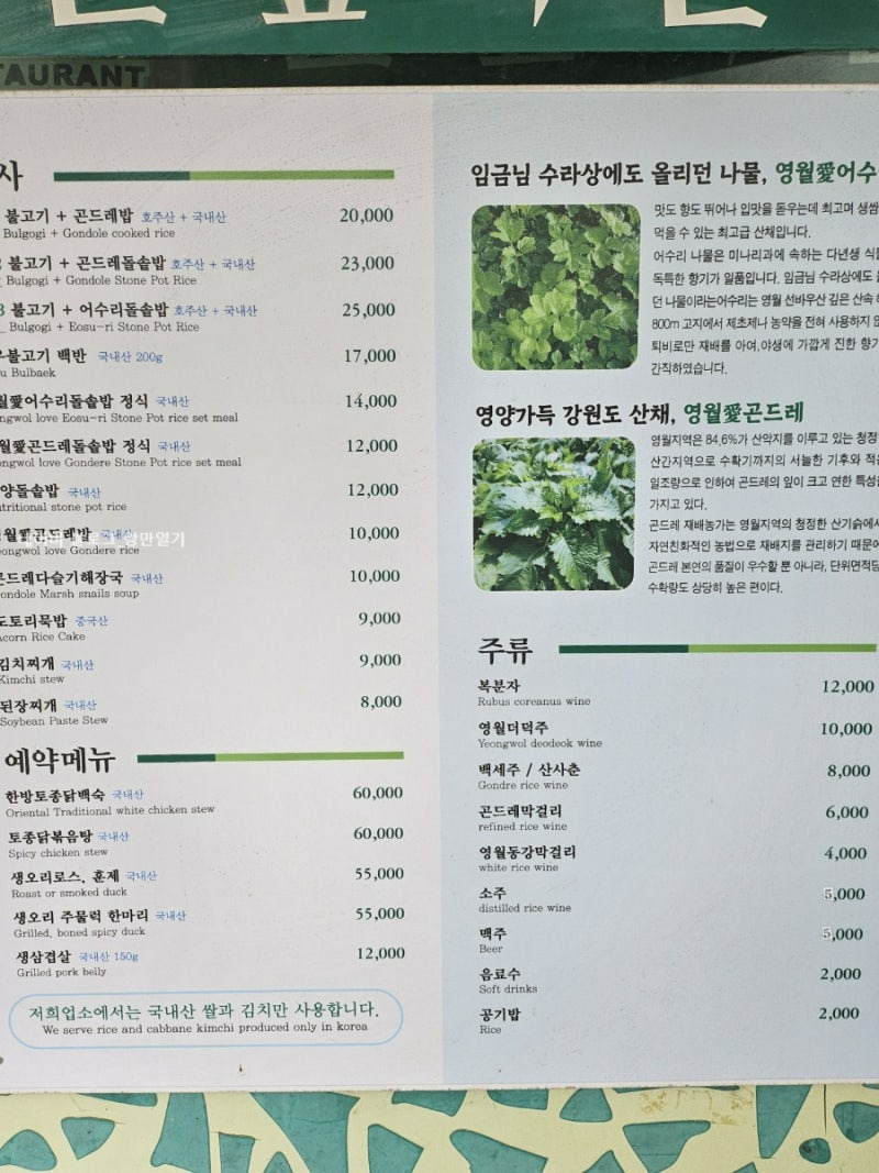 가격은 2,000원부터 60,000원까지 다양하게 구성되어 있어, 선택의 폭이 넓어요. 특히, 곤드레밥은 이곳의 인기 메뉴 중 하나로, 신선한 재료를 사용해 맛이 정말 뛰어나요.