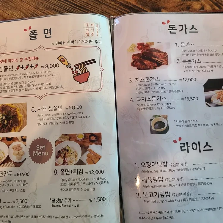 영주 나드리의 메뉴는 다양하지만, 특히 추천하고 싶은 메뉴는 '돈가스'와 '쫄면'이에요. 돈가스는 바삭한 튀김옷과 부드러운 고기가 조화를 이루며, 쫄면은 매콤한 소스와 함께 신선한 채소가 어우러져 정말 맛있답니다.