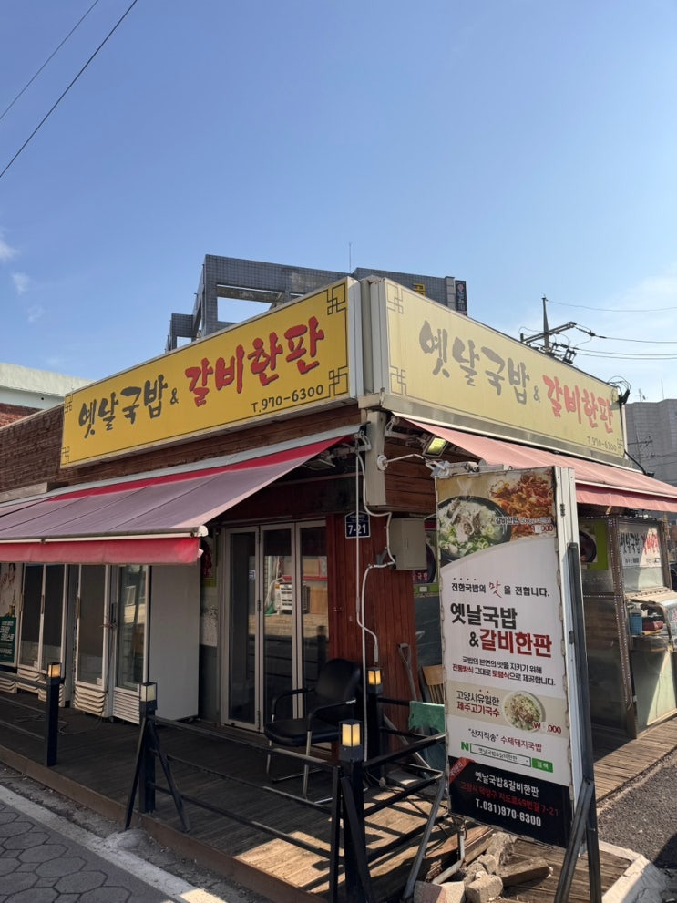 '옛날국밥 & 갈비한판'은 고양시 능곡동에 위치해 있어요. 이곳은 외관부터 전통적인 느낌을 주는데, 밝은 노란색 간판과 붉은 글씨가 인상적이에요. 입구에는 나무 데크와 몇 개의 의자가 놓여 있어, 편안한 분위기를 자아냅니다. 큰 유리창으로 내부가 보이는데, 햇살이 잘 들어오는 밝은 공간이에요.