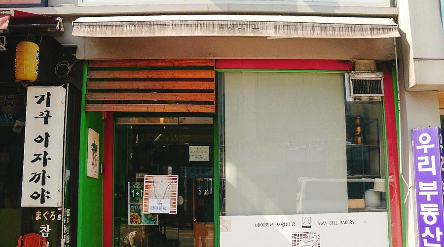 '오월의 종'은 이태원에 위치한 아늑한 베이커리입니다. 이곳은 외관부터 매력적이에요. 밝은 녹색의 입구와 큰 창문이 인상적이며, 나무로 된 차양이 아늑한 느낌을 줍니다. 주변에는 다른 상점들도 있어, 이곳을 찾는 손님들에게 편리한 위치에 자리 잡고 있습니다.
