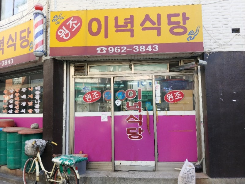 이녁식당은 서울특별시 동대문구 천호대로45나길 52, 1층에 위치해 있어요. 외관은 노란색과 분홍색 간판이 인상적이며, 유리문을 통해 내부를 살짝 엿볼 수 있어요. 입구 옆에는 이발소의 기둥이 세워져 있고, 자전거가 주차되어 있는 모습이 이곳의 소박한 분위기를 잘 보여줘요. 주변에는 푸른 통과 흰색 봉투가 놓여 있어, 지역 주민들이 자주 찾는 아늑한 식당이라는 느낌이 들어요.