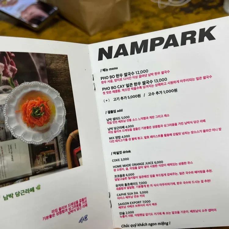 남박의 메뉴는 다양하지만, 가장 인기 있는 메뉴는 쌀국수에요. 특히 "PHO BO"는 12,000원, "PHO BO CAY"는 13,000원으로 가격도 합리적이에요. 이 외에도 한우설렁탕(10,000원)과 한우 쌀국수(12,000원)도 추천할 만해요. 메뉴판은 깔끔하게 정리되어 있어 선택하기 쉽답니다.