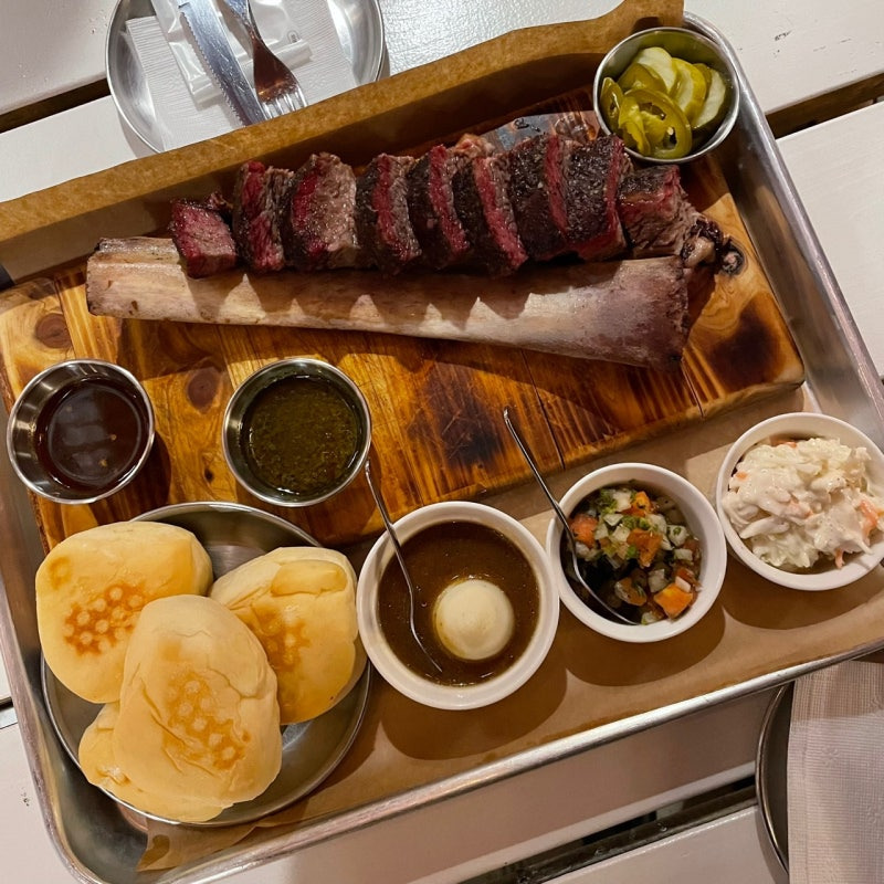 보일러스의 대표 메뉴는 포크립 세트인데요, 이 세트에는 푸짐한 고기와 함께 다양한 사이드가 제공돼요. 가격은 약 30,000원 정도로, 양이 많아 친구들과 나눠 먹기에도 좋아요. 특히, 훈제된 갈비와 브리스켓, 소시지가 함께 나오는 플래터는 정말 맛있어요!