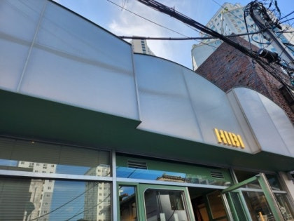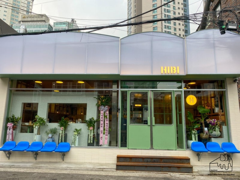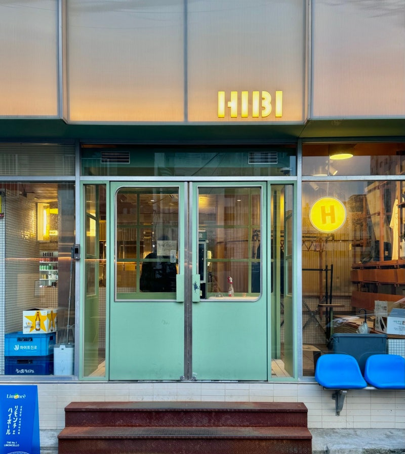 입구는 큰 유리창으로 되어 있어 내부가 잘 보이고, 'Hibi'라는 이름이 노란색 글씨로 크게 적혀 있어요. 주변은 고층 건물들이 많아 도심의 활기를 느낄 수 있는 곳이에요.