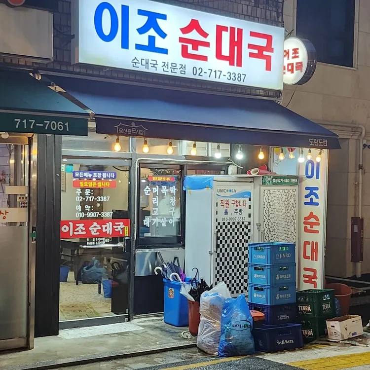 이조순대국은 용산 용문시장 근처에 위치해 있어요. 이곳은 전통적인 순대국을 전문으로 하는 식당으로, 오랜 역사와 함께 많은 단골손님을 보유하고 있답니다. 식당 외관은 밝은 빨강과 파랑의 조화로 눈에 띄며, 큰 유리창을 통해 내부가 잘 보이도록 되어 있어요.