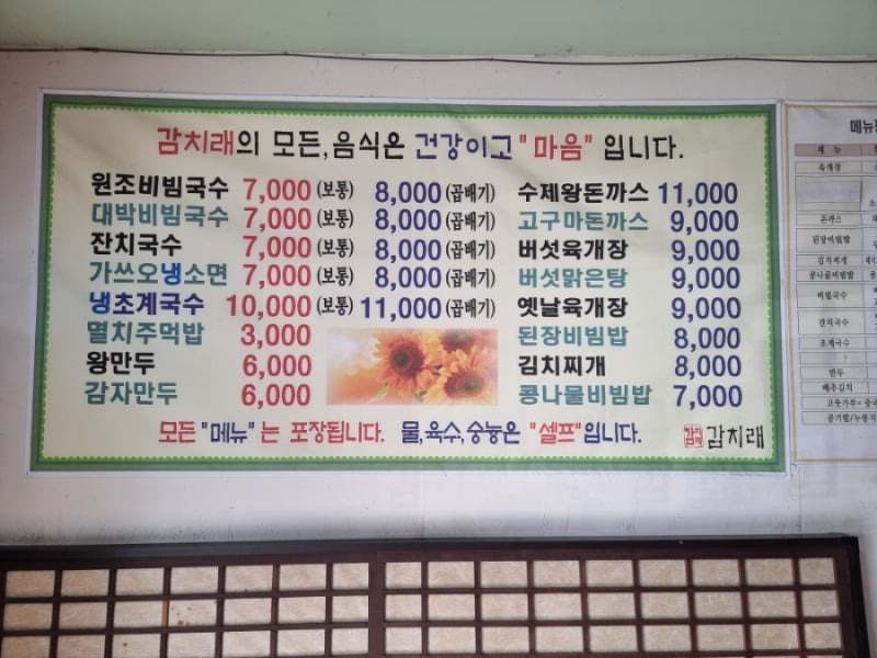 이곳의 추천 메뉴는 비빔국수와 국수입니다. 비빔국수는 기본 3,000원부터 시작하며, 곱배기와 왕돈까스도 인기 메뉴에요. 왕돈까스는 11,000원으로 푸짐한 양을 자랑해요.