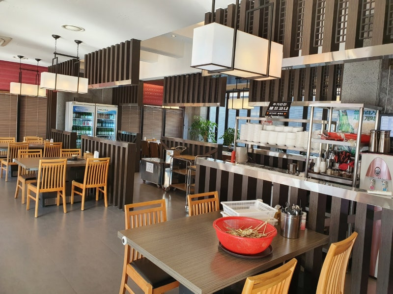 식당 내부는 깔끔하고 현대적인 인테리어로 꾸며져 있어요. 나무로 된 테이블과 의자가 조화를 이루며, 자연광이 잘 들어오는 큰 창문이 있어 밝고 쾌적한 분위기를 자아내요. 여러 개의 단체석이 마련되어 있어 가족 모임이나 친구들과의 회식에도 적합해요.
