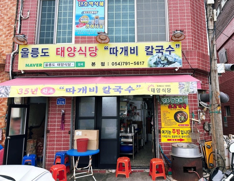 태양식당은 울릉도 서면 울릉순환로에 위치해 있어요. 이곳은 1995년에 개업하여 오랜 역사를 자랑하는 식당이에요. 식당의 간판에는 "따개비 칼국수"라는 문구가 적혀 있어, 이곳의 대표 메뉴를 한눈에 알 수 있답니다.