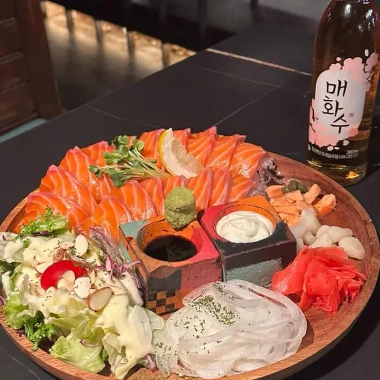 - 사시미 플래터 : 신선한 연어 사시미와 다양한 해산물이 함께 나와요.