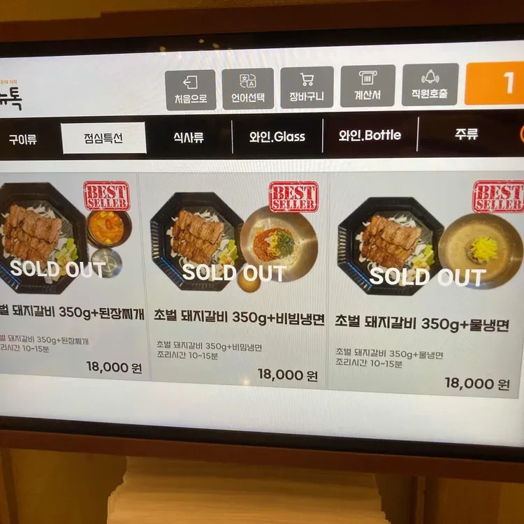 육향의 대표 메뉴는 초벌 돼지갈비와 소갈비에요. 초벌 돼지갈비는 18,000원으로, 비빔냉면이나 물냉면과 함께 세트로 주문할 수 있어요. 이 메뉴는 특히 인기가 많아서 자주 품절되곤 해요.