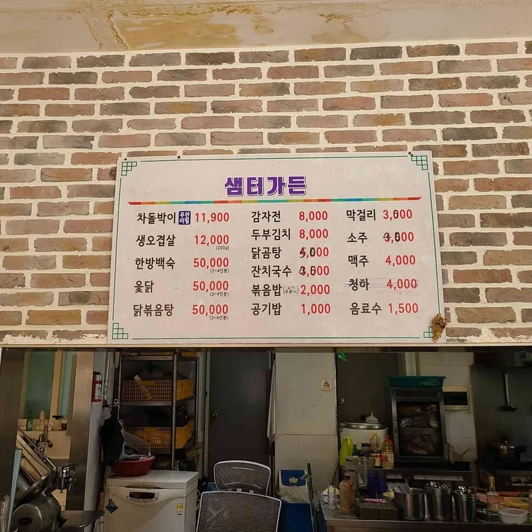 샘터가든의 메뉴는 다양하고 가격도 합리적이에요. 특히 차돌박이 무한리필이 인기인데, 가격은 11,900원이에요. 생오겹살은 12,000원, 한방백숙은 50,000원으로, 다양한 선택지가 있어요. 사이드 메뉴로는 감자전과 두부김치가 각각 8,000원에 제공되니, 함께 주문하면 좋겠죠?