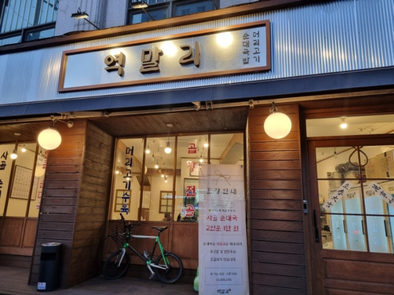 역말리순대국밥은 구산역 근처에 위치해 있어요. 외관은 전통적인 느낌을 주면서도 현대적인 감각이 잘 어우러져 있어요. 나무로 된 외벽과 금속 간판이 조화를 이루고, 큰 유리창을 통해 내부가 보이는 구조라서 지나가는 사람들의 시선을 끌어요.