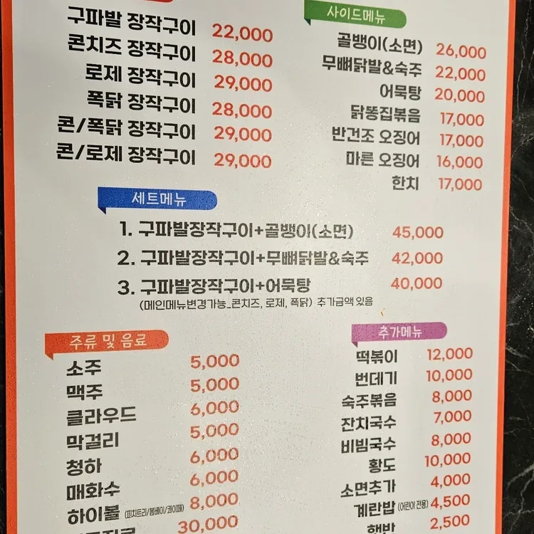이곳의 대표 메뉴는 바로 구파발 장작구이에요. 가격은 20,000원으로, 푸짐한 양과 맛을 고려하면 정말 합리적인 가격이에요. 그 외에도 다양한 세트 메뉴가 준비되어 있어, 여러 가지 음식을 한 번에 즐길 수 있어요. 예를 들어, 구파발 장작구이와 함께 제공되는 어리굴젓, 소면 추가 등도 인기랍니다.