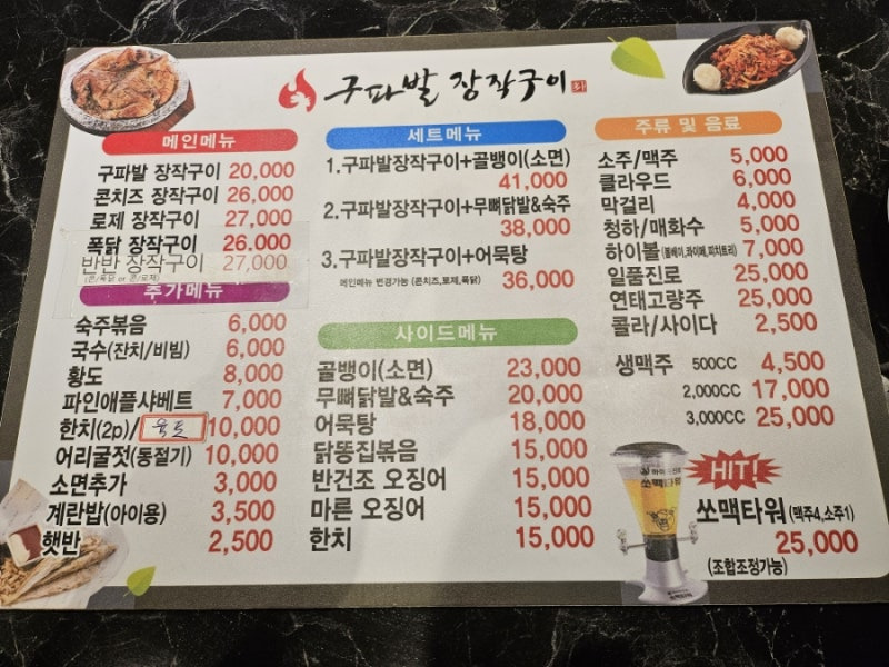 또한, 이곳의 특별한 음료인 쏘맥타워도 추천해요. 가격은 25,000원으로, 친구들과 함께 나눠 마시기 좋은 사이즈에요. 메뉴판을 보면 다양한 음료와 안주가 준비되어 있어 선택의 폭이 넓어요.