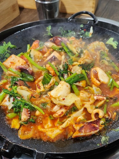두꺼비집의 대표 메뉴는 바로 불오징어예요. 신선한 오징어와 다양한 채소가 어우러져 매콤한 양념에 볶아져 나오는 이 요리는 정말 맛있어요.